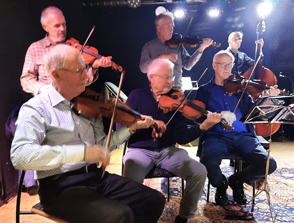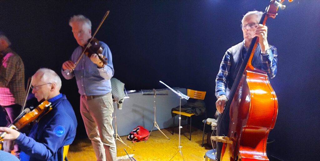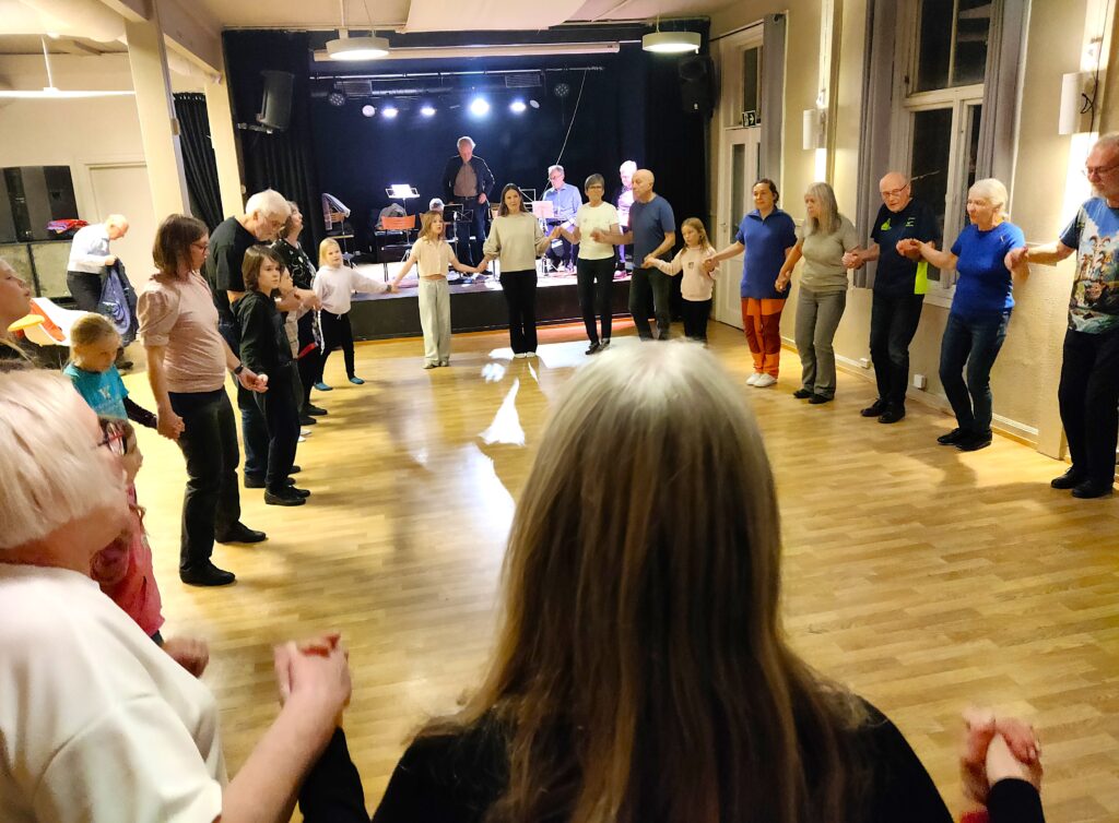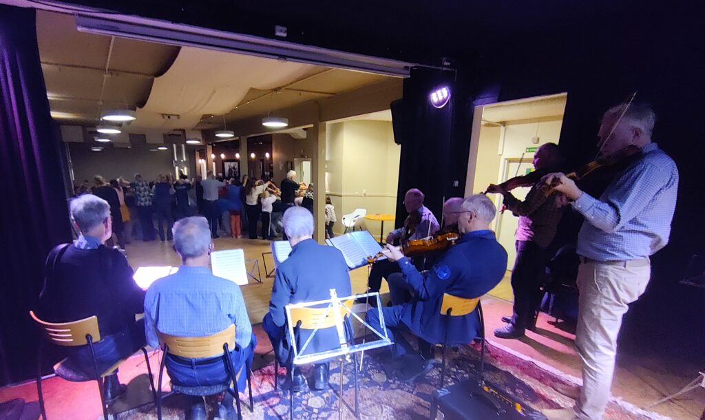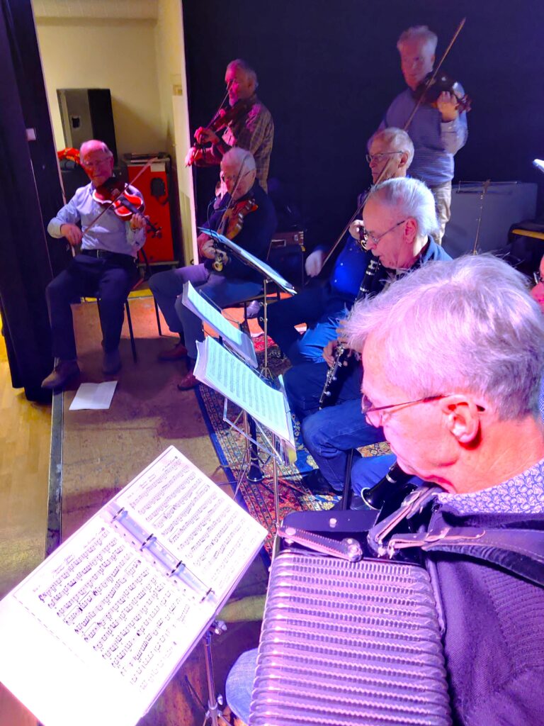 Romsdal Spelemannslag stilte opp med en noe redusert gruppe, men var mer enn spillbar og stemningen var på topp fra start til mål. Vi brukte gode låter fra vårt rikholdige repertoar, og innimellom var det lagt opp til instruksjon for de yngste danserne.